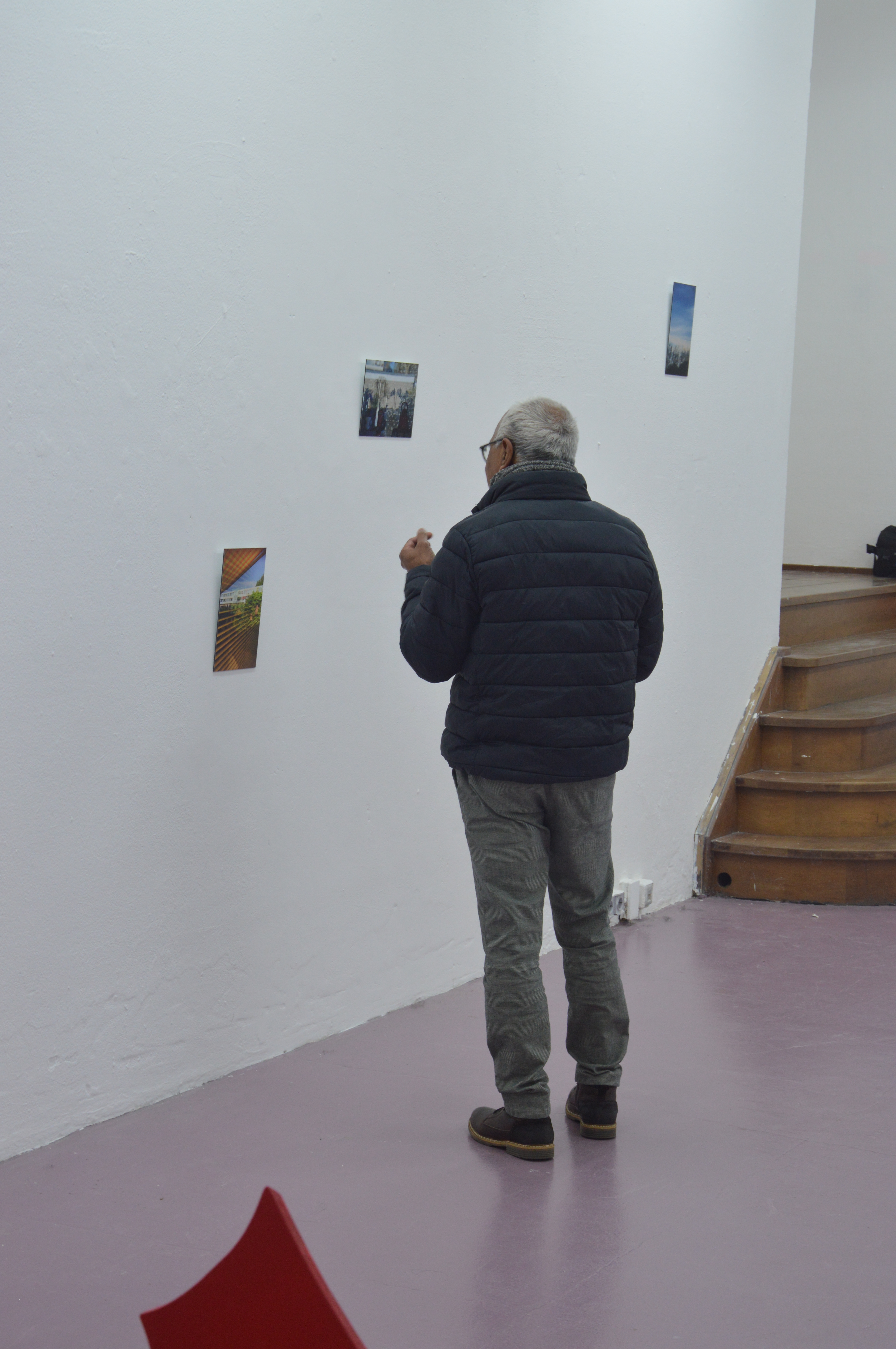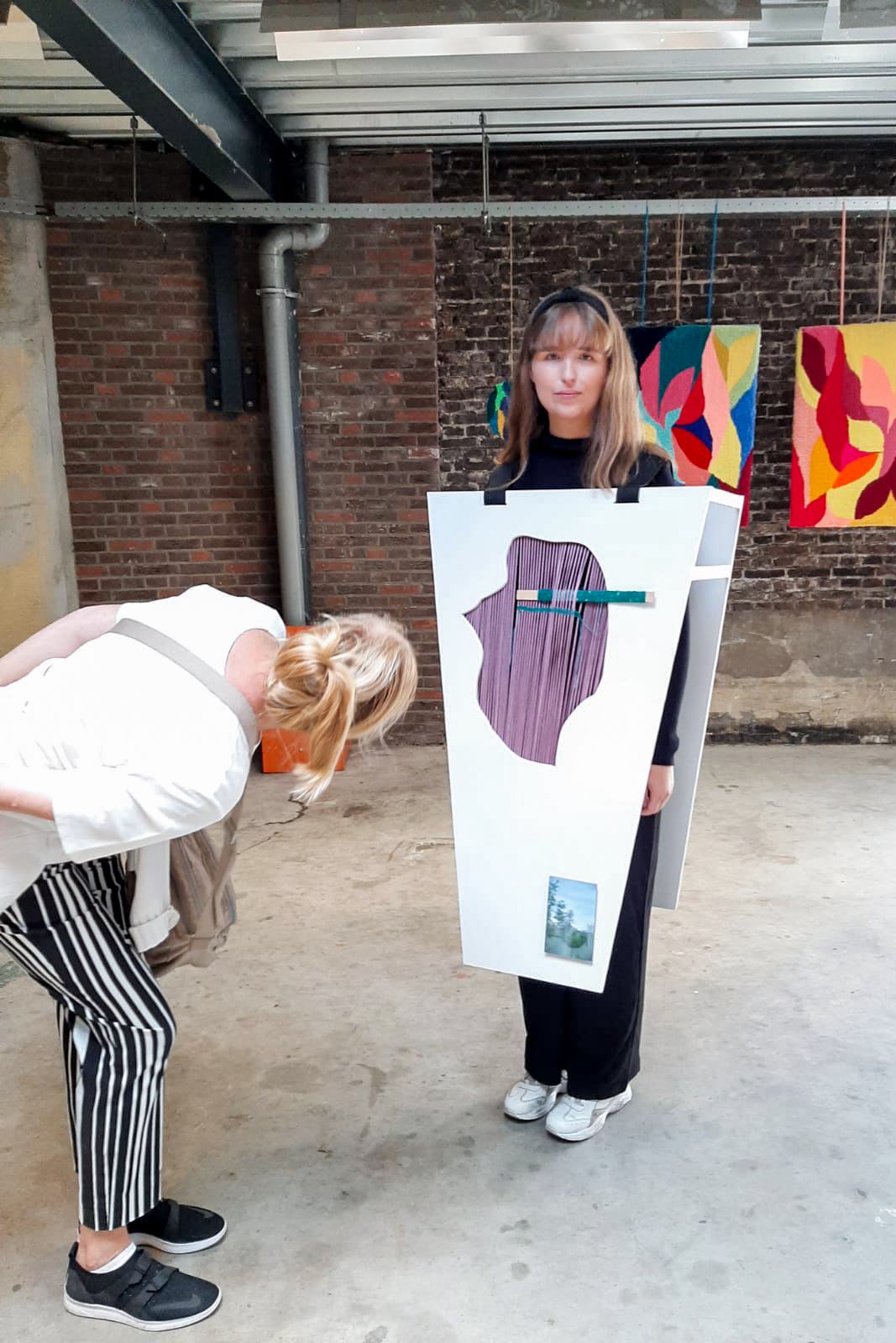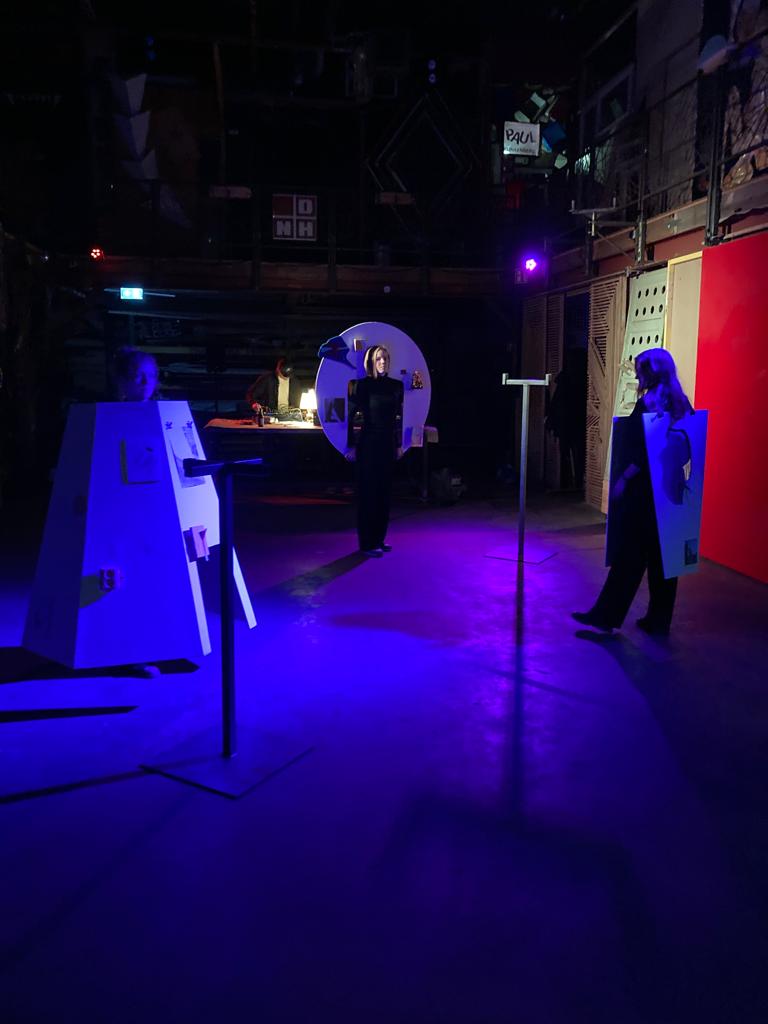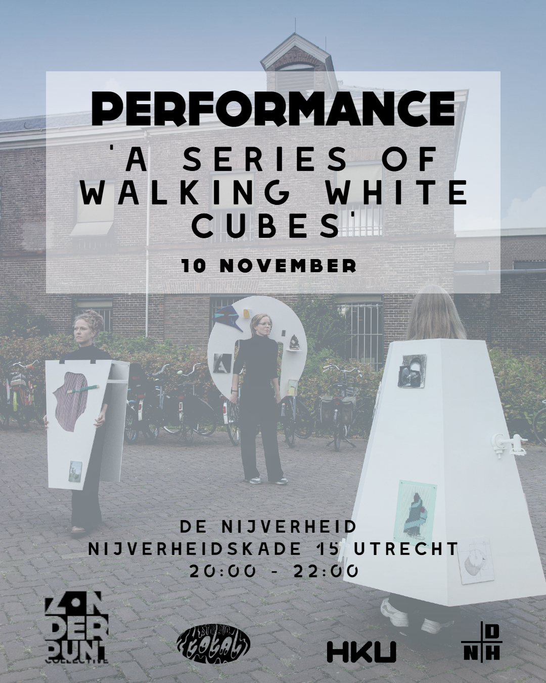 Na onze performance ‘a series of walking white cubes’ tijdens kunstmanifestatie CareFull van Art Utrecht gepresenteerd te hebben, toonden wij de draagbare expositie vlak hierna ook nog een keer bij Studio Total in de loods van de Nijverheid. Ondersteund door de elektronische muziek van Staschh en in de donkere ruimte, zorgde dit voor een heel andere ervaring.